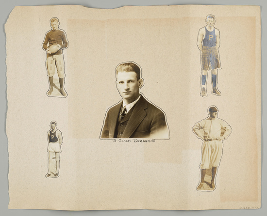Five cut-out portraits of Athletic Director and Coach Frank M. Dobson in his roles as coach of football, basketball, track, and baseball at Richmond College.