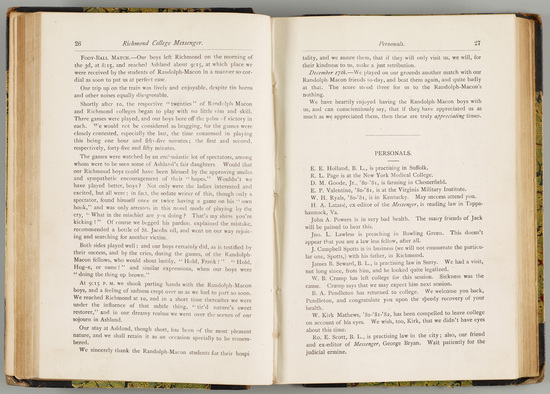 P. 26-27 of The Richmond College Messenger, date unknown. Includes articles "Foot-Ball Match" and "Personals".