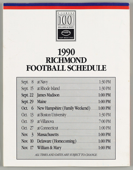 "University of Richmond Football '90. Media Guide," in UR Football Comes Home : Presented by Univ. of Richmond Archives and Boatwright Memorial Library, Item #70, https://football.urlibraries.org/items/show/70 (accessed March 6, 2026).